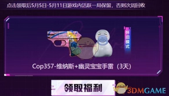 3、5月5日至5月11日期间能够领取:Cop357 - 维纳斯 + 幽灵宝宝手雷(3天)。