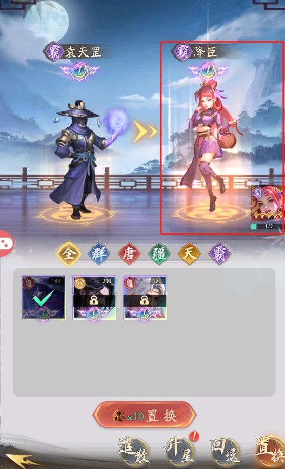 当侠客星升达到登封1阶后,便能以置换的方式,换取所需的侠客。不过,置换仅能在相对阵营的侠客间进行。例如,群、唐、疆这三个阵营的侠客可相互置换,天、霸阵营的侠客也能相互置换。而且,要满足置换条件,置换对象必须拥有7张本体卡。