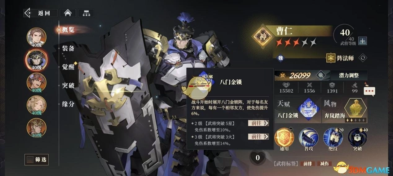 ⑤曹仁天赋【八门金锁】和职业【阵法师】能双重增幅我方减伤,孙坚的全体推条可以延缓敌方时序。