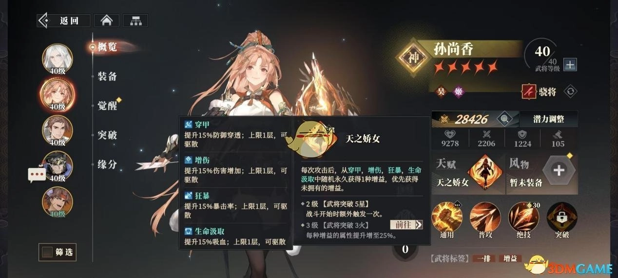 孙尚香释放大招后的下一次普攻会变成二连击,此效果能借助将军的邀战来触发。当拥有5星天赋,且在首回合释放大招,再通过邀战达成二连击时,孙尚香在首回合就能稳定叠满4种增益,从而激活【丹翎】,获取15%的速度提升以及100%的减益抵抗效果。