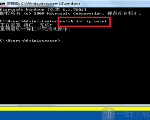 4、输入命令代码“netsh int ip rese”,重置TCP/IP协议与端口即可。