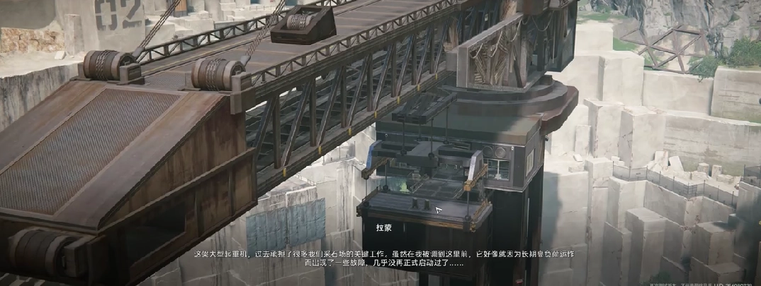 剧情进展到此处,系统便会向你发布修复大型起重机的任务。接受任务后,玩家需先朝着吊舱前进。在此之前,我们得去检查起重机的供电中枢。供电中枢是吊舱前方矗立的两个电子板,确认供电正常后,直接驾驶吊舱朝对面的采石场旧址移动即可。