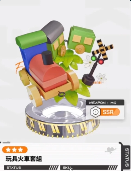 玩具火车套组(迪赛尔):SSR稀有度的机枪,这个玩具火车套组象征着迪赛尔的梦想和希望,它驶向新的目的地,就像迪赛尔在战斗中不断追求进步和突破一样,这把机枪在迪赛尔的手中,就像是童年梦想的延续。