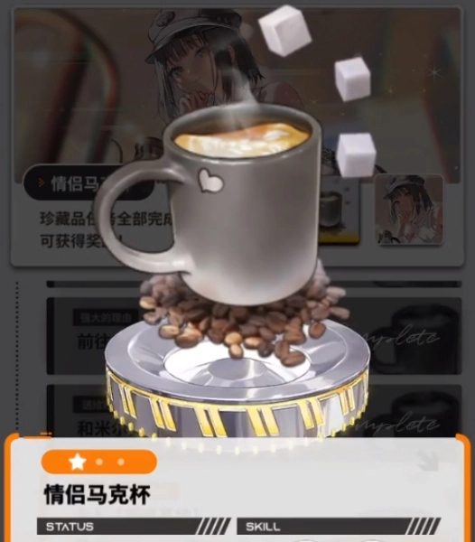 情侣马克杯(米尔克):这是一件稀有度为SSR的收藏品,其武器类型为狙击步枪,它就像是一对热恋中的情侣,相互依偎,每当米尔克拿起这对马克杯,就仿佛感受到了爱人的陪伴,在战斗中也会得到加成。