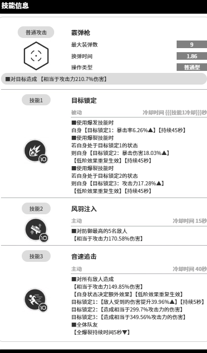 接着看她的技能体系,技能1为目标锁定。当使用爆发技能时,自身会获得目标锁定1效果,暴击率提升6.26%,该状态持续45秒。在此期间,每次攻击更易触发暴击。而当使用爆裂技能时,若自身正处于目标锁定1状态,就会激活目标锁定2,暴击伤害变为18.03%,同样持续45秒,此时她的暴击伤害得以提升。