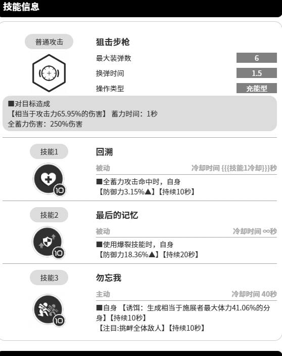 而“最后的记忆”同样是德尔塔极为重要的被动技能。当使用爆裂技能时,此技能便会被激活,进而让德尔塔自身的防御力瞬间提升51%。而且这种强大的防御力提升状态能够维持20秒。在这20秒期间,德尔塔几乎摇身一变,成为了战场上坚不可摧的防御角色。至于“勿忘我”,它是需要玩家手动使用的爆裂技能,该技能的冷却时间为40秒。一旦发动,便会触发一系列强大的效果。