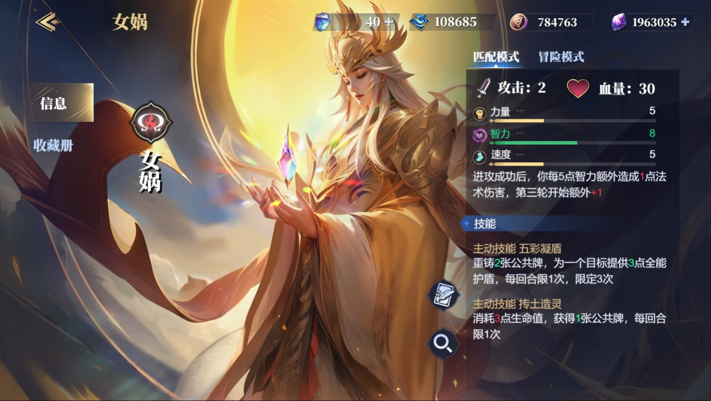女娲,初始攻击力2点,30血量,力智速初始三维为5/8/5