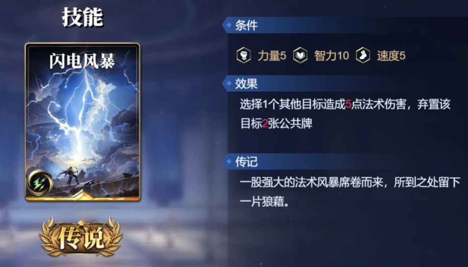 闪电风暴这张卡牌,其效果极为强劲,能够造成5点法术伤害,同时弃置目标2张公共牌。然而,它的缺点也十分显著,那便是对智力属性的要求过高,仅适用于部分初始属性值较高的神灵携带。以女娲为例,其力、智、速的初始三维数值为5/8/5 ,借助三重神力,便能够直接满足使用闪电风暴的条件。