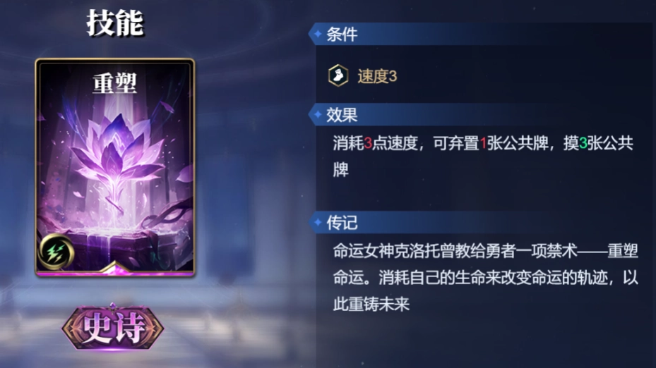 重铸2张公共牌,为一个目标提供3点全能护盾,每回合限1次,限定3次