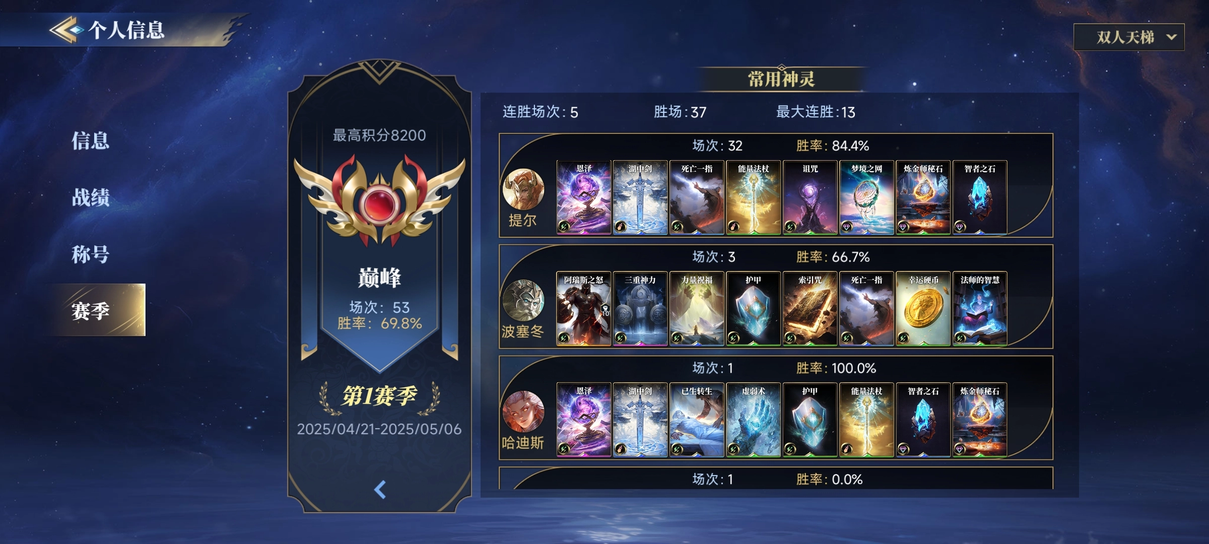 3说句实话,这单人排位体验实在太差劲了。连着打了五天,到后面排位都禁两个神灵,可匹配到的对手还总禁提尔,逼得我只能用不擅长的神灵去对战,真的让人难受得想吐。尤其是碰到那些很会搭配卡片的对手,完全就是被虐得体无完肤。