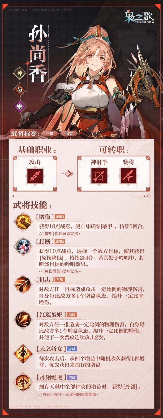 我将以第一视角,亲身体验三国少年们的成长历程!在百万文字精心构筑的剧情里,邂逅那些栩栩如生的人物,他们以生命与理想奏响壮丽的挽歌。接下来,由我为大家带来详细的《三国志幻想大陆2:枭之歌》孙尚香角色介绍,希望这篇内容能对大家有所帮助!