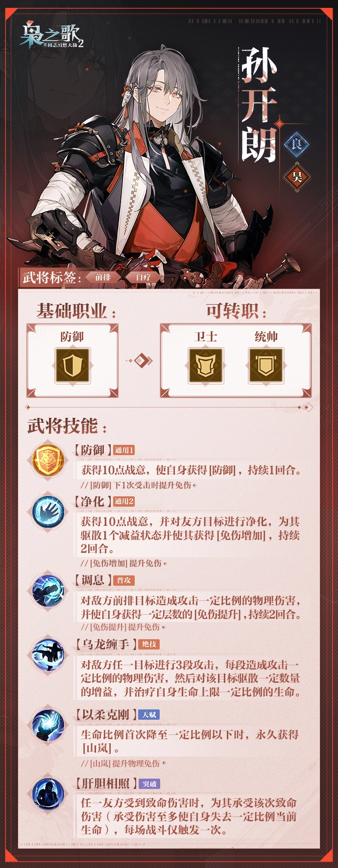 挣脱传统卡牌的束缚,多维度转职与更自由的羁绊组合,助你尽情挥洒策略才华。下面,就由小编为大家带来详细的《三国志幻想大陆2:枭之歌》孙开朗角色介绍,希望这篇文章能对大家有所帮助!