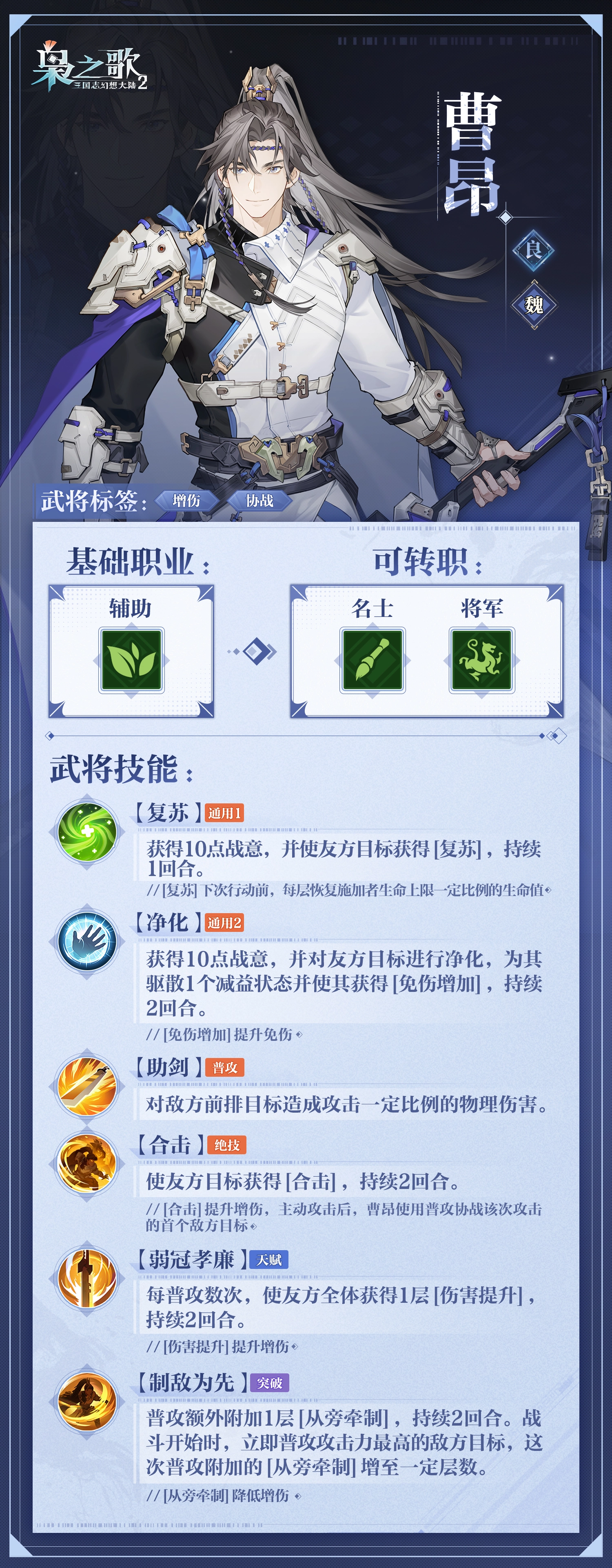 基础定位:魏国的蓝色品质良将,属于辅助型武将。其作战重点在于为团队增加伤害,以及通过协战进行追击,同时还具备对敌方施加减益效果从而实施压制的能力。