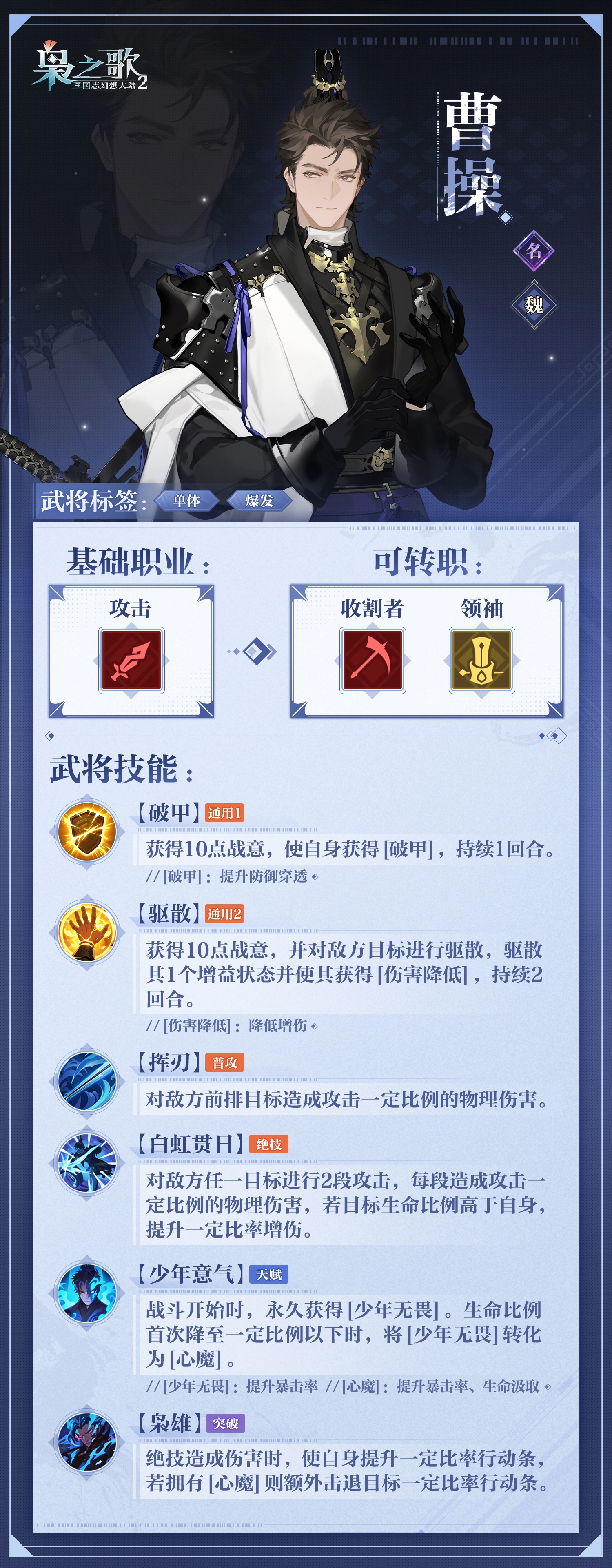 基础定位:魏国神将级别的攻击型武将,主要侧重于单体爆发输出以及行动条的控制,同时具备吸血续航与破甲穿透的能力。