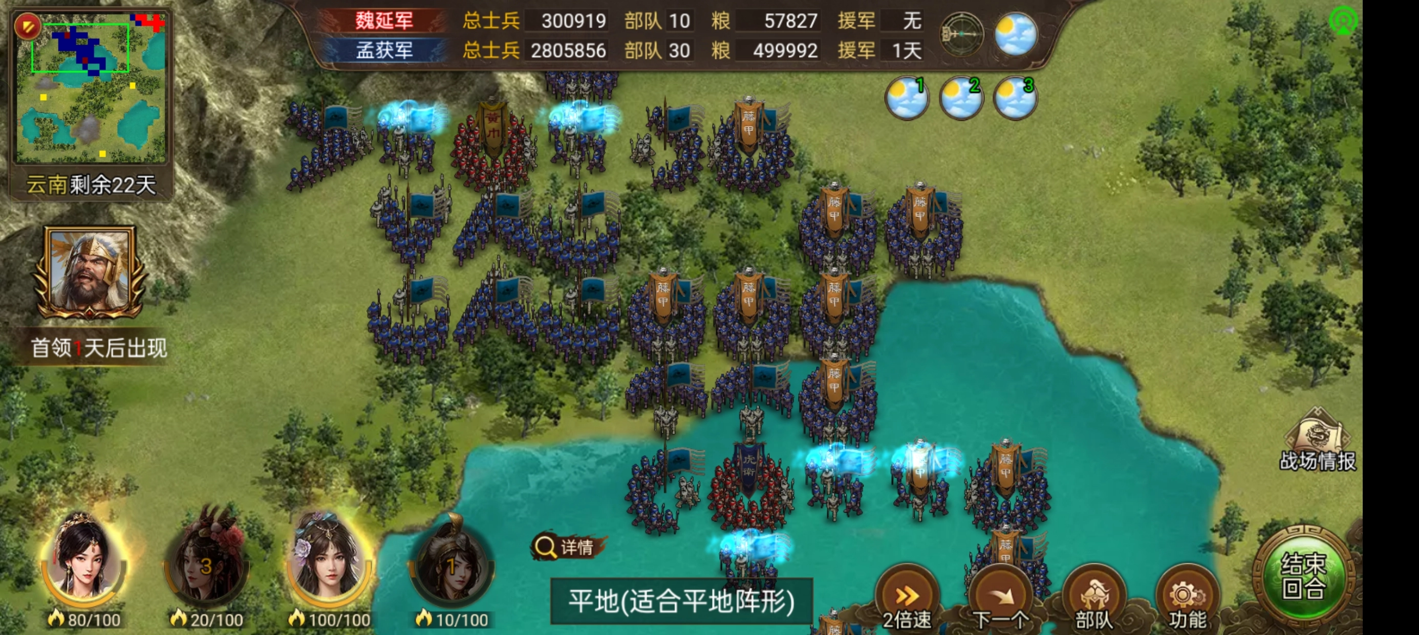 进入孟获的战斗场景后,指挥那两名自建的军师向前行进,以此把敌人引开,而攻击主力则先隐蔽好。