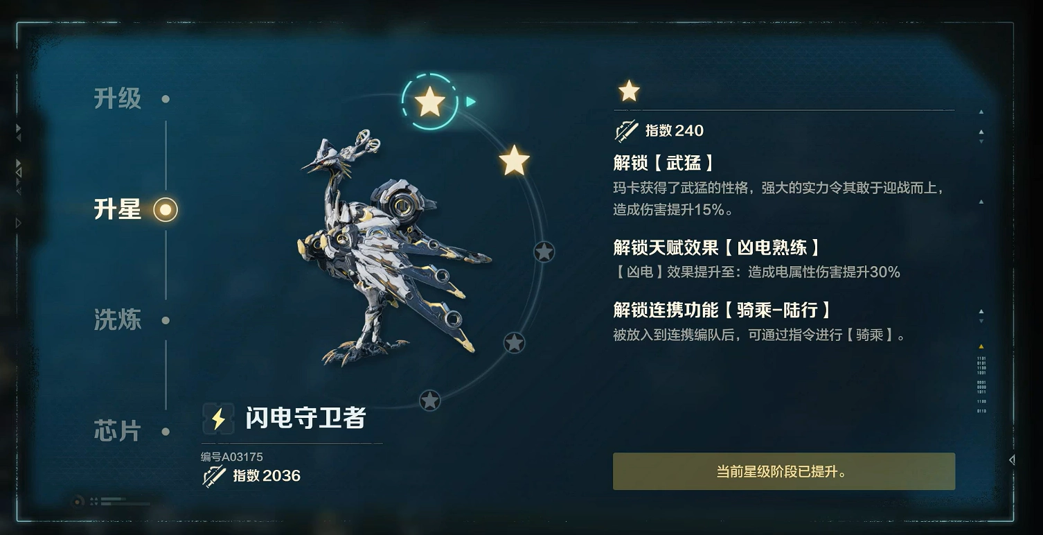 宠物升星的代价如此高昂,那这个功能究竟有什么实际作用呢?从图中可以看到,玩家通过给宠物升星,能够为其觉醒极为强大的能力。就拿闪电守卫者来说,升第1颗星就能使伤害直接提高15%,后续能力提升的幅度更是相当可观。