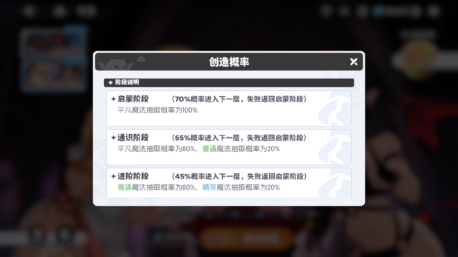 前往夺宝页面中的魔法创造,每天能免费领取10个传承龙晶。点击页面中央的水晶球来注入龙晶能量,起始于「启蒙阶段」,每次注入都有机会进入到下一层,要是失败就会退回到初始阶段(点击右上角的卡池就能查看具体概率)。