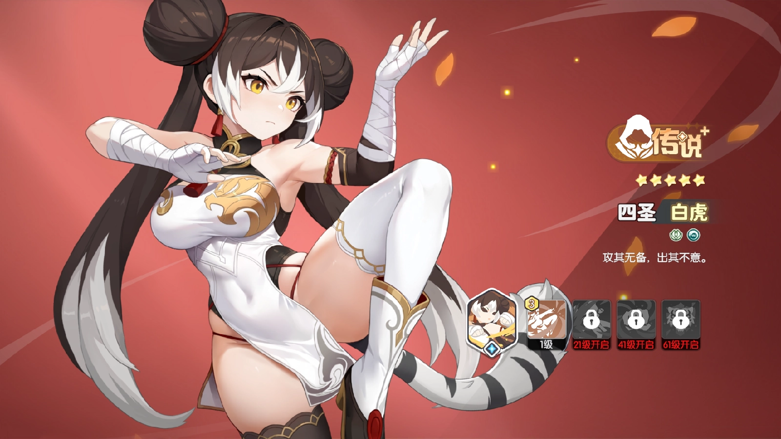 白虎能够借助释放奥义技能空中百裂腿,以消耗自身血量的方式发动超高攻击,与此同时,通过百裂连打积攒怒气,待进入【狂野】状态后,攻击得以提升。