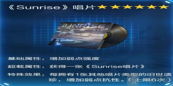 4、《Sunrise》唱片能够强化玩家的弱点强度,是较为稀有的加成道具之一。