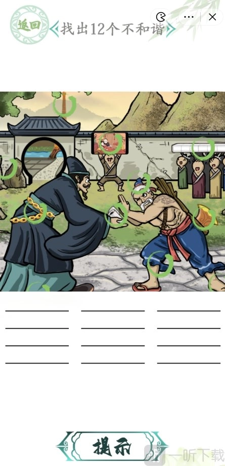 各位能够瞧见,下方图片上存在12个绿色圆圈,而图片里这些圆圈所标注之处,便是本关中12个不协调的地方,具体如下: