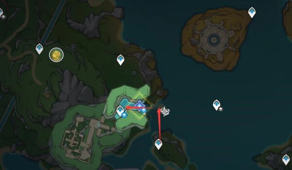 1、首先,我们要打开地图,前往卡布狄斯堡遗迹所在位置,与图中左侧蓝色标记处进行互动。