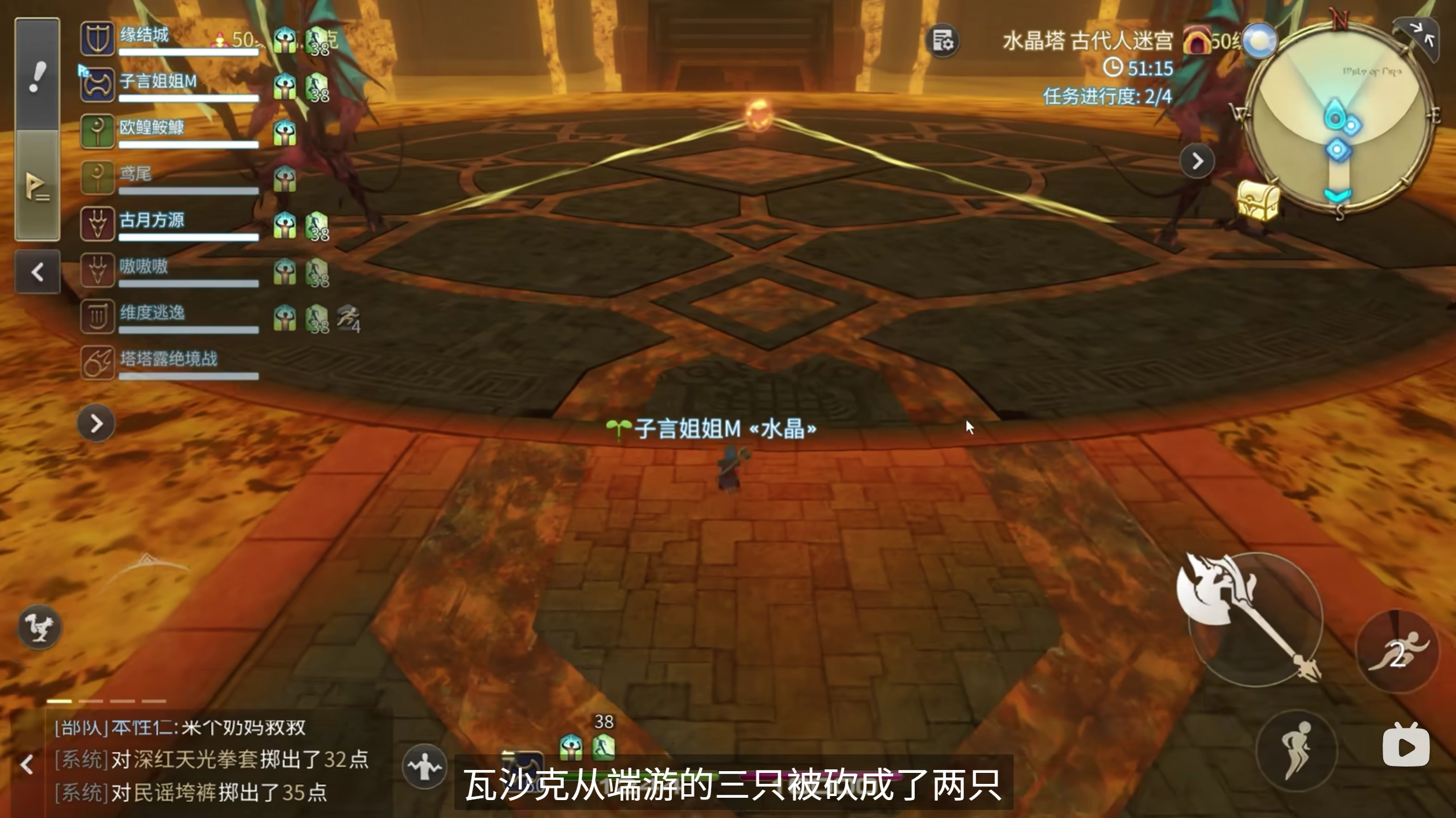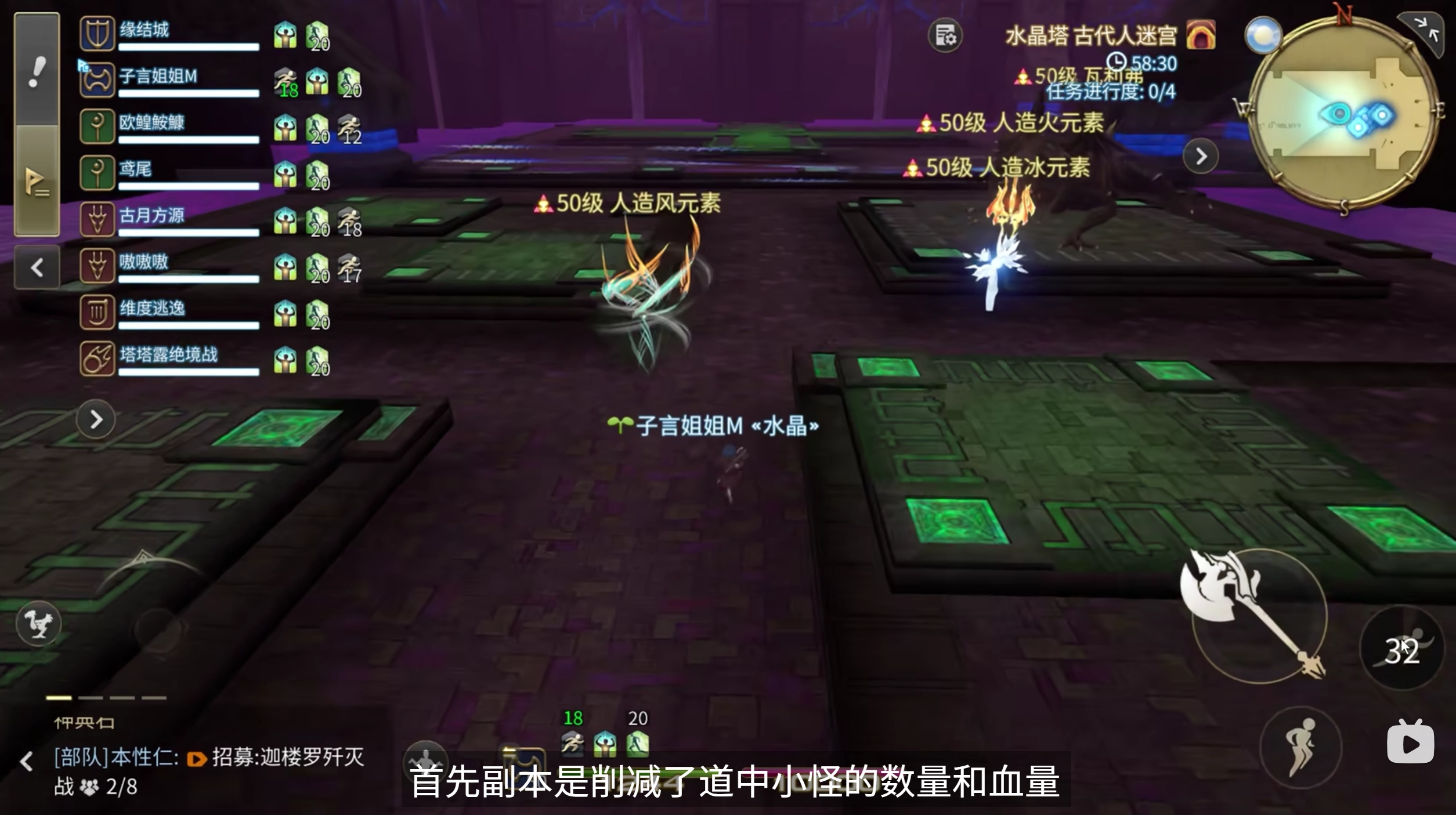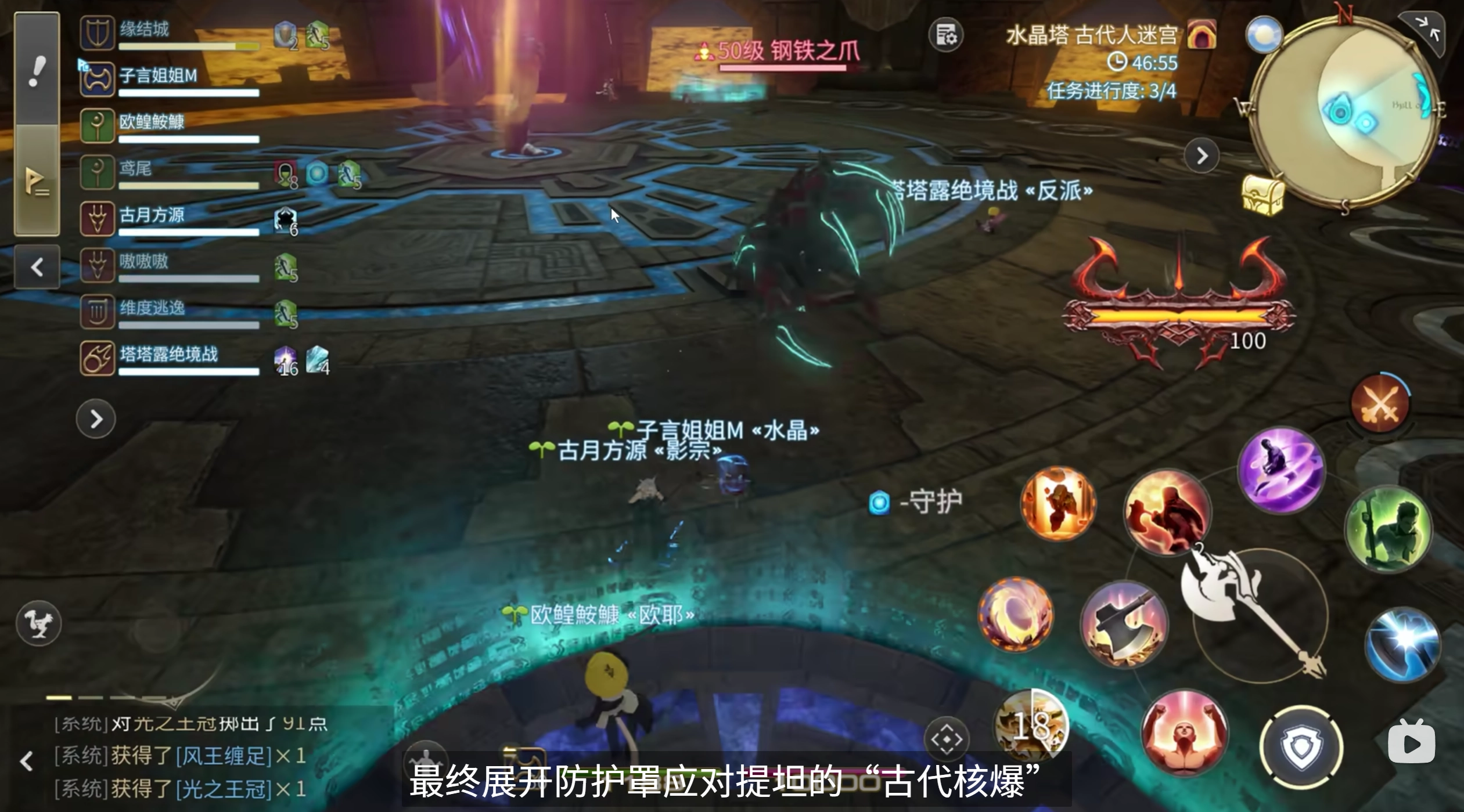 目前手游仅开放了一个大型任务——水晶塔 古代人迷宫。在端游里,这个副本是24人本,而手游中则变为八人本。我个人推测,人数削减或许是由于手机性能受限,比如同屏显示人数的限制等因素,这一改动应该是为了更好地适配手机端。