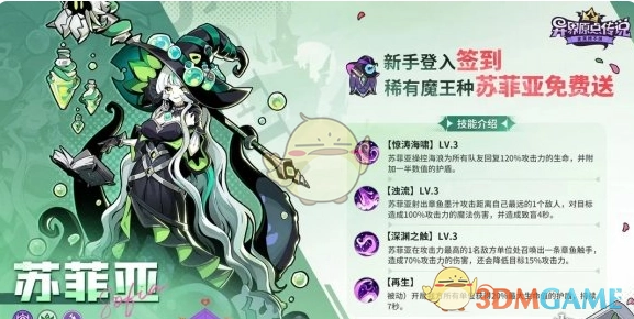 1、苏菲亚是签到即送的辅助角色,自身具备回复、加盾与控制能力。