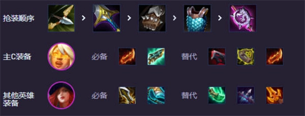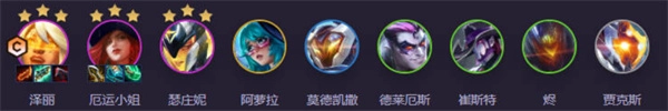 这套阵容的核心主C为泽丽,副C是厄运小姐,凭借多段伤害与范围爆发突破前排,并对后排进行收割。