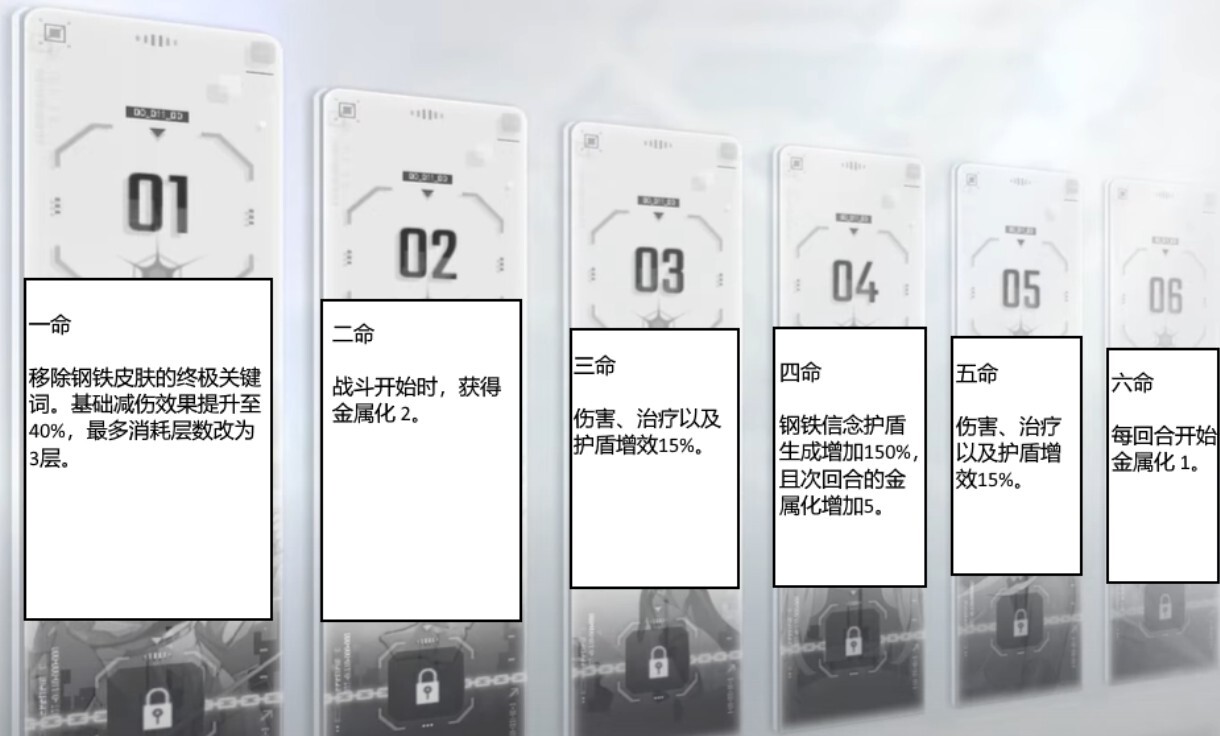 其实卡牌后期激活后赋予的命座数值各有不同,大家也可以将这里的命座理解为另一类技能加成机制。比如游戏里的核心角色艾美,她的命座效果中包含不少关键属性加成,涉及伤害、治疗与护盾增效的百分比数值。艾美共有6层命座效果,其中1命和6命的强度最为突出:1命能触发“钢铁皮肤”效果,让她的基础减伤能力提升40%,同时最大消耗层数调整为三层;而5命带来的是叠加类效果,有15%的概率提升基础伤害、治疗量以及护盾数值——这些命座效果都能为角色带来显著的属性增益。
