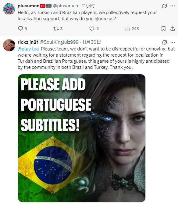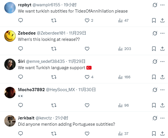 在《湮灭之潮》官方推特的每条动态下方,都有不少国外玩家反复留言,呼吁游戏支持当地语言。像巴西、土耳其等国家的玩家,在这方面的呼声尤为高涨。