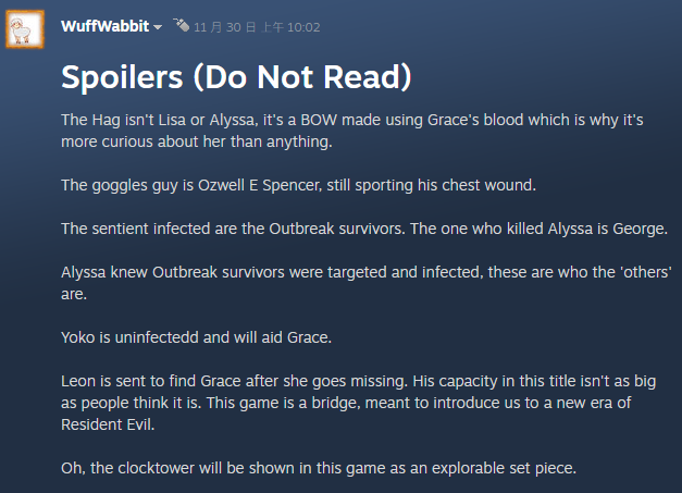 近日,用户WuffWabbit在Steam社区发布了一系列有关《生化危机9:安魂曲》的爆料内容。按照他的说法,这些信息的来源是Reddit社区的一位匿名爆料者,并非大家熟悉的Duskgolem。