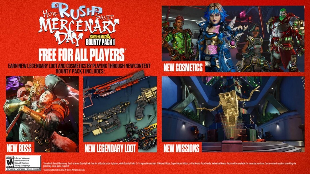 《无主之地4》即将推出五个售后DLC赏金包,其中第一个是《赏金包1:拉西的佣兵节拯救计划》。该赏金包对所有玩家免费,而后续的赏金包2、3、4、5则包含在《无主之地4》豪华版、超级豪华版以及赏金包捆绑包内,同时也支持单独购买。需要注意的是,游玩这些内容均需拥有《无主之地4》基础游戏。