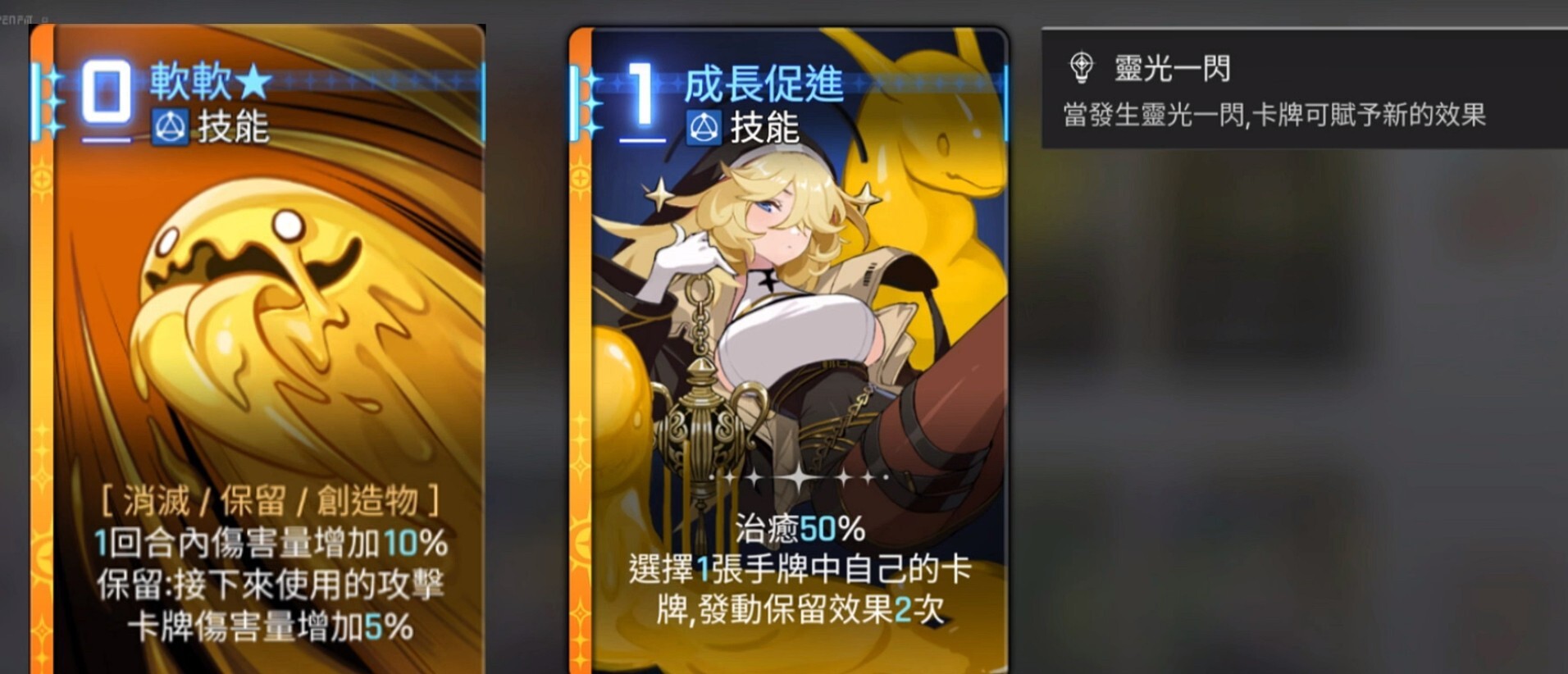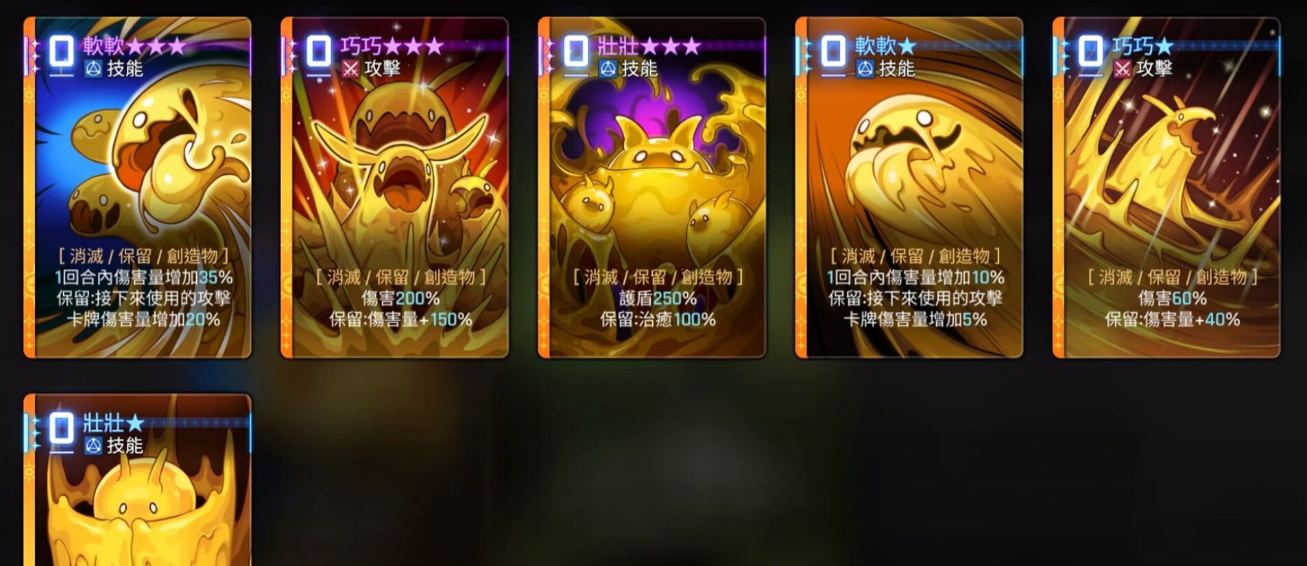 创造物软软拥有一张0费技能卡,使用后能让本回合伤害提升10%,同时为下一张攻击卡附加5%的增伤效果,处于预留状态时,该增伤效果还能以乘算方式叠加。
