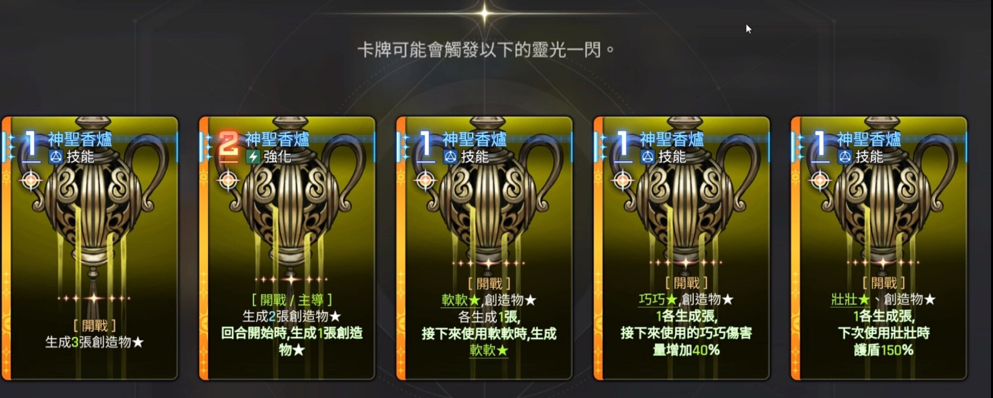奥尔利亚的创造物机制,其技能核心围绕生成与进化创造物卡牌展开。初始卡牌“神圣香炉”在回合开始时会生成两张创造物,这些创造物能通过融合实现进化升级,最高可达三星,可为团队提供护盾、治疗以及伤害提升等增益效果。