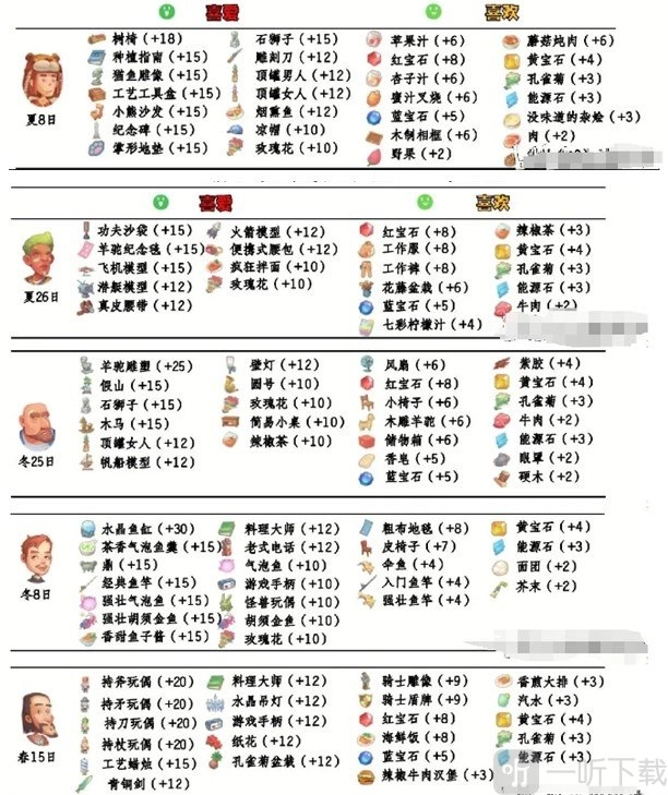 以上便是小编为大家整理的《波西亚时光》最新NPC喜好礼物表。依据表中所记的喜好赠送礼物,能让你快速赢得NPC的大量好感。今天的分享就到此结束,感谢您的查阅。