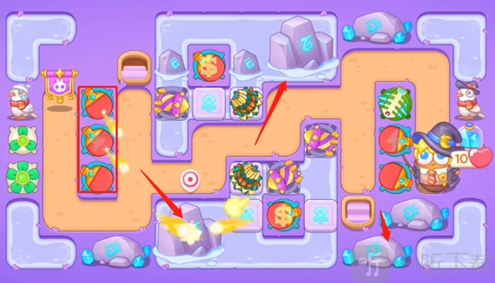 3、接下来,增添线上的炮台,并清除场上全部炮台。此关卡中石头道具较为丰富,同时要留意确保导弹数量充足。