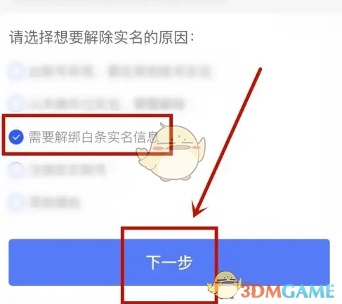 3、进入实名解除页面,填入相关信息,选定解除实名的原因,然后点击【下一步】。