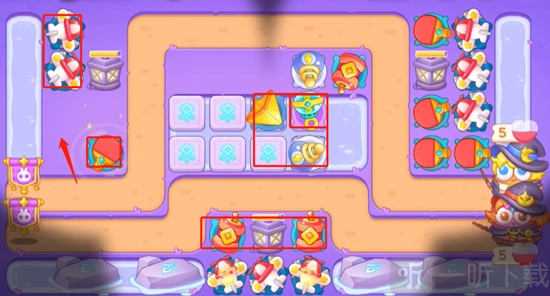 5、最后,我们在中间位置继续安放炮台,此处务必使用减速泡泡。这一关的难点在于前期需锁定目标攻击,不然萝卜就会被吃掉。