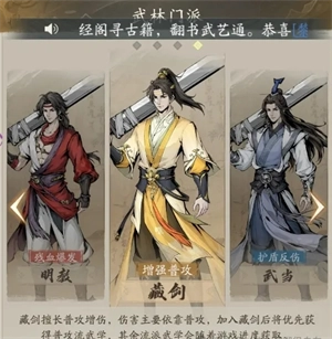 游戏中一共有四大门派,分别为以护盾反伤见长的武当派、主打持续伤害的丐帮、强化普攻的藏剑,还有残血时能爆发强大力量的明教。