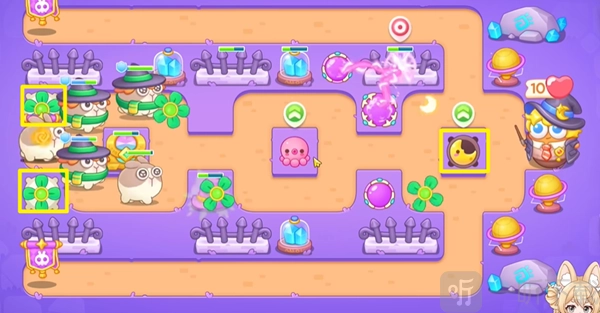 1在《阿波与魔法宝藏》第27关开始时,首先在最左边搭建四叶草炮塔,接着在右边构建魔法球,此时我们要开启地图中的宝箱炮塔。