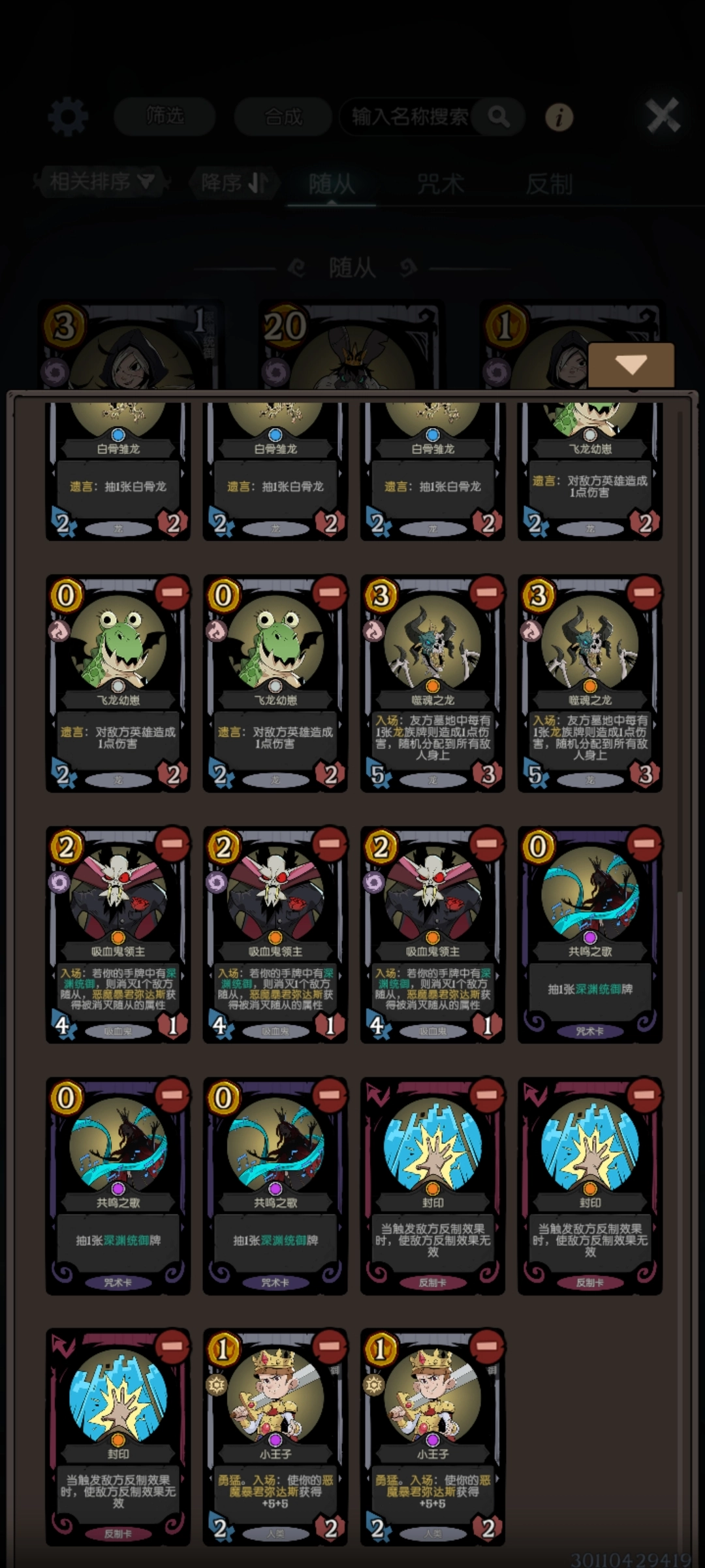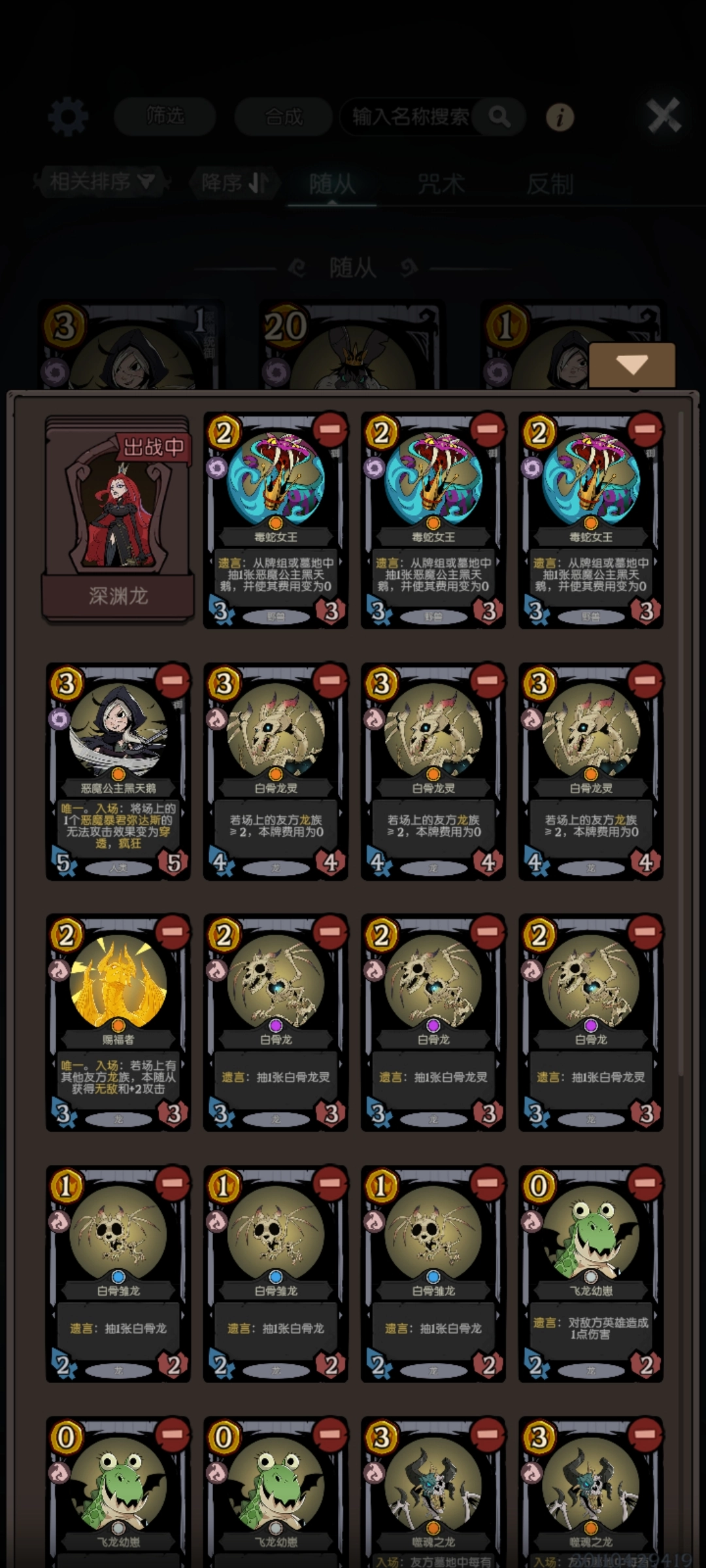 龙族英雄的质量实在堪忧,那有没有质量上乘且能带动龙族的英雄呢?嘿,兄弟,还真有!皇后的深渊体系,堪称性价比超高的小轴。毒蛇与黑天鹅的联动,场面互换以及抢血能力都是一流的。搭配白龙的combo,很容易在前期就打出场面压制,有效弥补了暴君未登场时,深渊套牌场面不足的缺陷。而且这套体系能够快速施压,迅速召唤出深渊套的暴君,接着利用吸血鬼领主吸取攻击力与血量(你的就是我的!)。当然,对面可能会用3费法术复活一个角色,随后黑天鹅负责完成斩杀。所以,当对面暴君体型较大时,务必先确保能斩杀,再去压制对面血量。