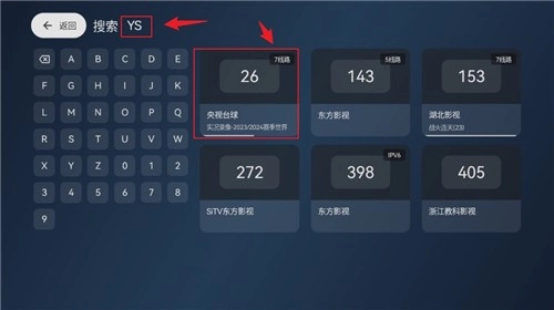 在搜索页面输入想要查找的节目,例如若要搜索央视台球,直接选取央视的首字母就能完成搜索。