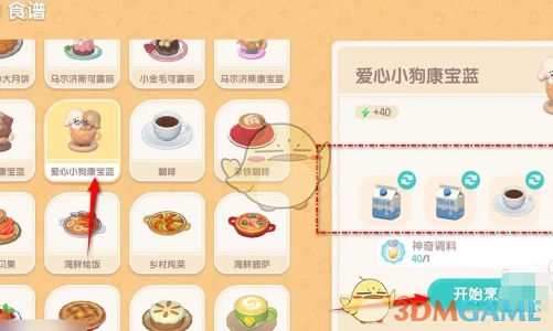 2步骤二:开启料理食谱,选中爱心小狗康宝蓝,备好2份咖啡与2份牛奶,接着在右下角点击“开始烹饪”。