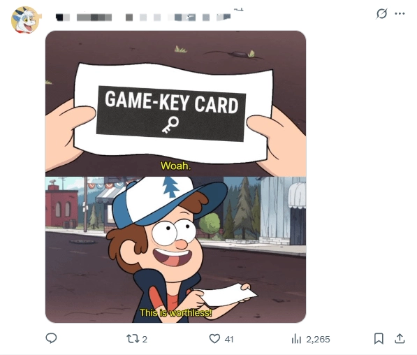 Switch2公布后,游戏钥匙卡一直受到玩家的诸多批评。这种钥匙卡尽管保留了实体卡带的外观形态,可实际上里面并未存储游戏数据,所以玩家拿到卡带后,还得通过联网的方式下载游戏内容。