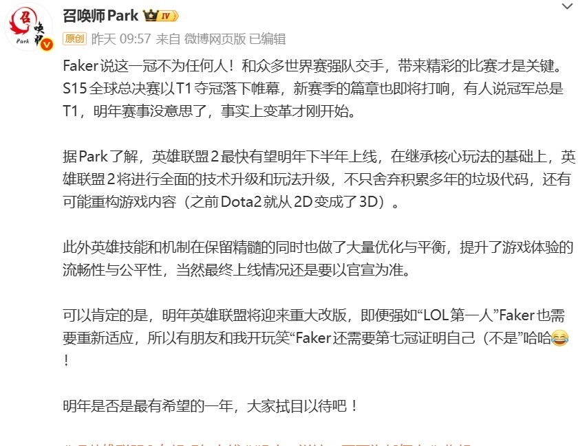 近日,《英雄联盟》领域的知名博主“召唤师Park”透露,《英雄联盟2》最快有望于明年下半年推出。