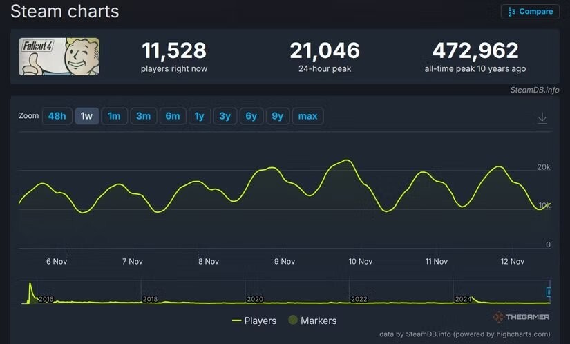从SteamDB的数据可以看到,游戏发售当天的最高在线人数达到22,690人,但很快就回落到了9,000人左右的区间,初步推测这是由于玩家集中下载更新造成的。不过在此之后,在线人数始终没有回升,最高同时在线人数仅为21,046人。这一数据显示,周年纪念版既没能成功召回老玩家,也没能有效吸引新用户。不过需要考虑到,这次更新导致《辐射4》的大部分mod都无法使用,所以可能大部分玩家会等到mod完全适配后再回归游戏。另外还有一种可能性,就是确实有新玩家尝试加入,但由于本次更新问题较多,新玩家在体验了大约两小时后就选择了退款。