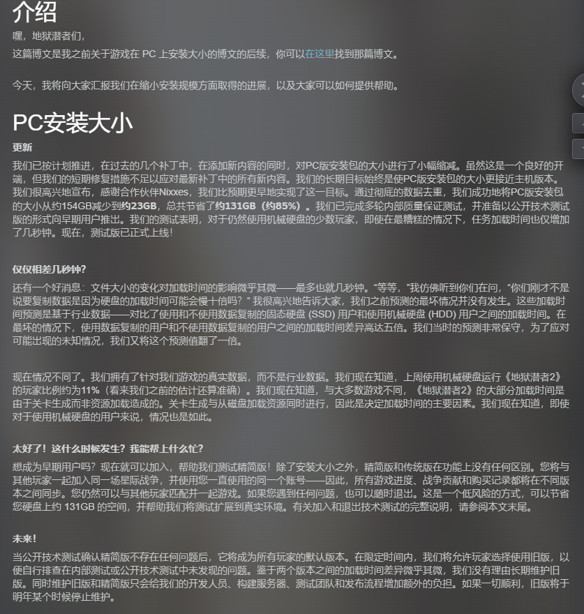 终于有游戏厂商开始关心玩家的硬盘容量了!《地狱潜者2》PC版此前因文件体积过大,长时间占用玩家大量硬盘空间的问题,如今终于得到了实质性的优化。开发团队Arrowhead Game Studios近期通过更新推出了“瘦身版本”,游戏整体所需的存储空间大幅减少了约85%。