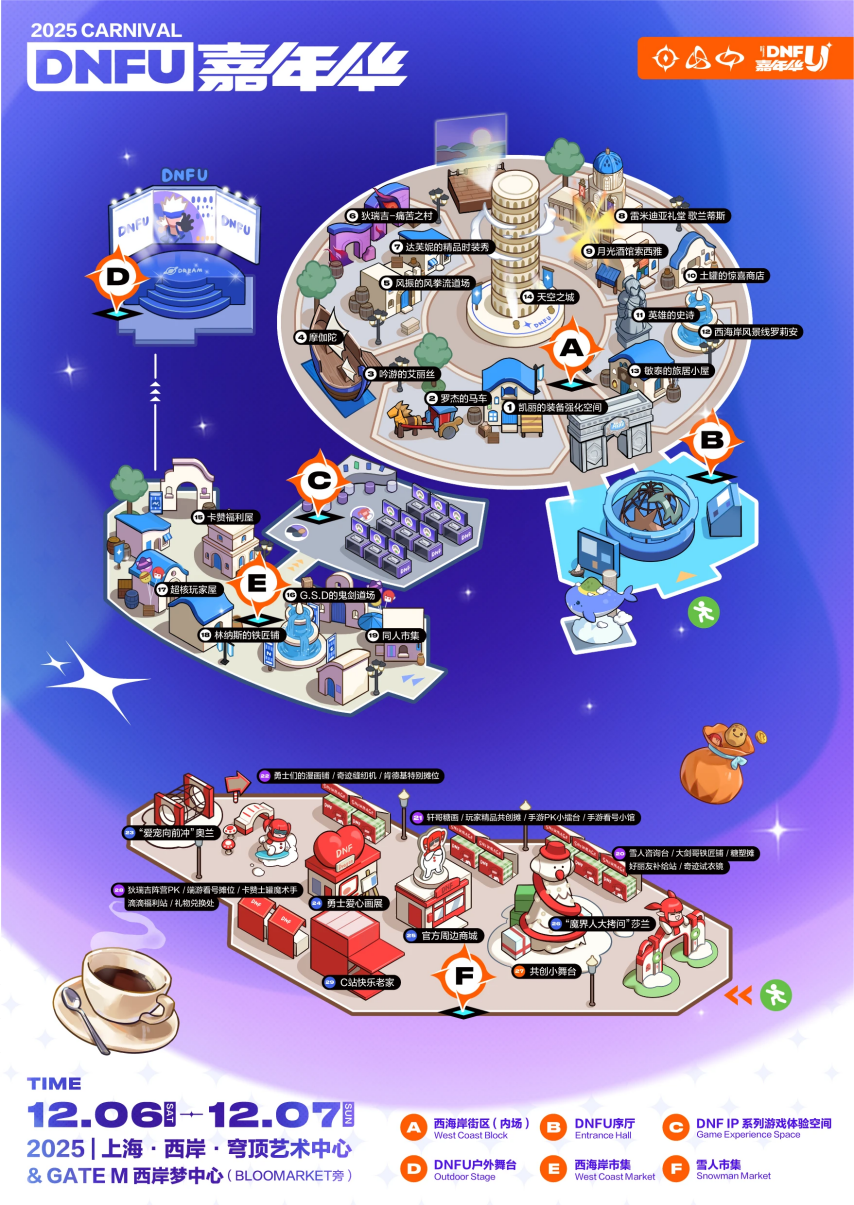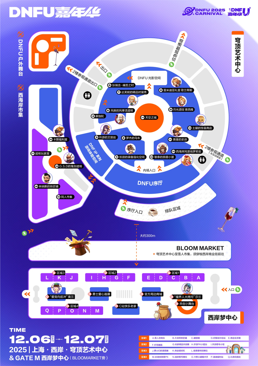 为保障每位玩家的体验,西海岸街区(穹顶中心内场)的体验需分时段、实名预约入场,大家可前往“西岸生活”小程序搜索“DNFU嘉年华”进行预约,线上预约通道将于12月4日10:00正式开启。
