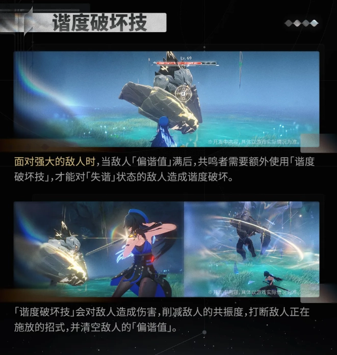 1. 设计了类似《只狼》架势条的机制,当条值打满时,会对敌方造成额外伤害并触发打断其当前动作的效果,该效果存在冷却时间(可参考线上Boss活动中的处决流程来理解)。2. 对应新体系的角色将带有两个全新属性:其一为“震谐”,触发后可发动追击效果。3. 另一个属性是“集诺”,机制为根据队伍中带有该标签的角色人数,额外叠加一层人数+1的debuff,后续再依据debuff的总层数为队伍提供相应的额外增伤加成(具体数值暂未明确)。