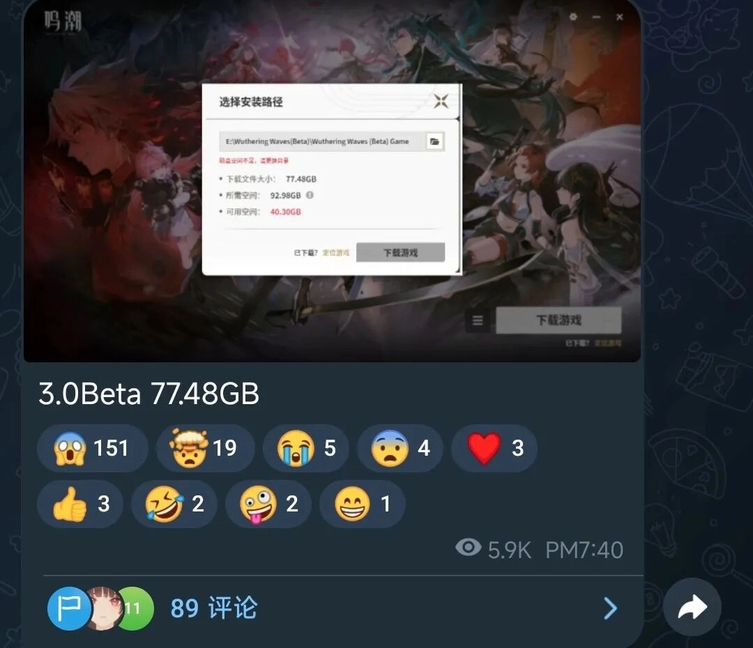 3.0版本的PC安装包已经发布了,大小约77G,PC端的更新内容大概要78G,这次3.0的体量确实不小。不过之前鸣潮推出过资源清理功能,只是目前还在测试阶段,希望能尽快正式上线。虽然鸣潮在细节优化上的反馈越来越好了,但安装包体积也越来越大,实在让人有些担心。在最近的周报里,还有不少漂泊者提到了移动端的优化问题,希望官方在做好新版本内容的同时,也能同步推进移动端的优化工作!